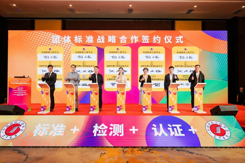 会议举行了团体标准战略合作签约仪式,中国纺织工程学会、纺织生物工程及信息学会(TBIS)、莱茵技术监护(深圳)有限公司、清华苏州环境创新研究院污染物中心、上海罗中科技发展有限公司、无锡一棉纺织集团有限公司、深圳市英柏检测技术有限公司将在标准研制、转化、检测等方面深入开展战略合作。