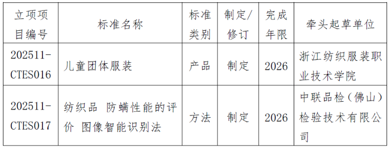 我会批准《儿童团体服装》《纺织品 防螨性能的评价图像智能识别法》等2项团体标准立项,现予以公布。