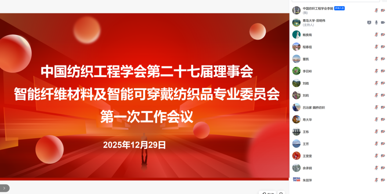 2025年12月29日,中国纺织工程学会第二十七届理事会智能纤维材料及智能可穿戴纺织品专业委员会(以下简称“专委会”)第一次工作会议以线上形式召开。专委会主任委员、副主任委员及秘书长等20余人参加本次活动。