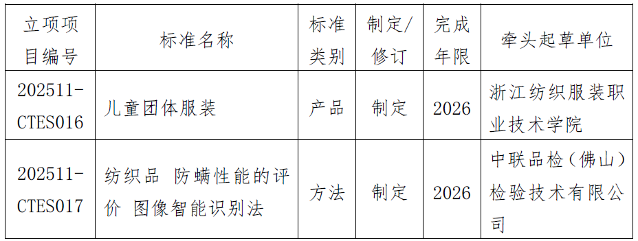 我会批准《儿童团体服装》《纺织品 防螨性能的评价图像智能识别法》等2项团体标准立项,现予以公布。
