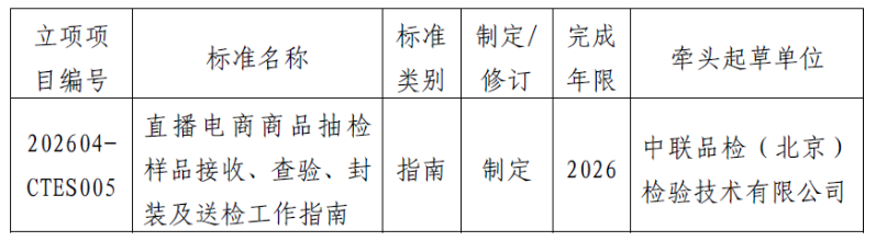 关于《直播电商商品抽检 样品接收、查验、封装及送检工作指南》团体标准立项的通知