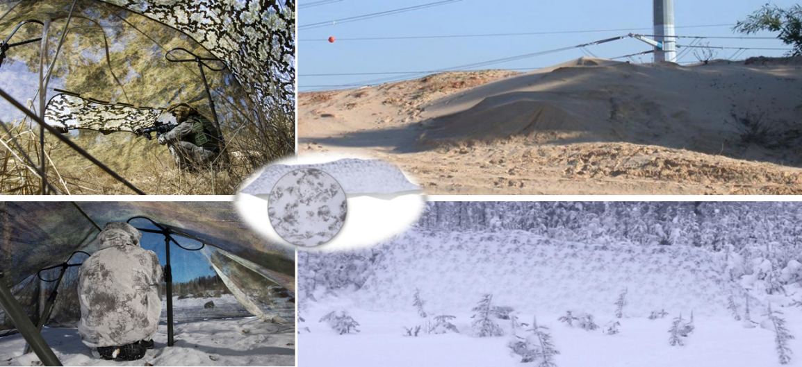 1.伪装屏: 核心部分由聚酯网等网状基底和附着其上的切花迷彩布、无切花聚酯层等伪装材料构成,提供视觉和光谱伪装。雷达防护型通常混入不锈钢等金属纤维来散射雷达波。